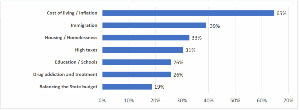 Representing the vast majority of Mainers, 65 percent of respondents cited inflation and the cost of living as one of the most important problems facing the state today. This was followed by immigration at 39 percent, housing and homelessness at 33 percent, and high taxes at 31 percent.