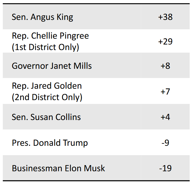 With respect to those who are currently representing the State of Maine, Sen. King was found to be the most well-liked politician with a 65 percent approval rating and a net favorability of 38 points.