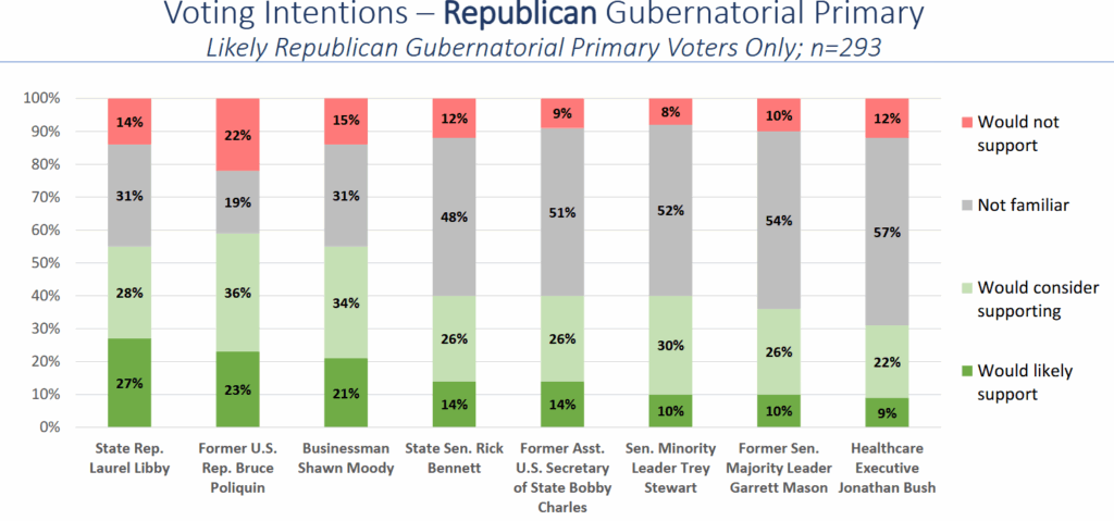 Republicans appeared most likely to support State Representative Laurel Libby (R-Auburn) when counting intensity of support as a factor (27 percent likely and 55 percent including possible), although when adding in those who would consider giving their support, former U.S. Representative Bruce Poliquin (R) gains a slight advantage with 23 percent likely but 59 percent when considering possible.