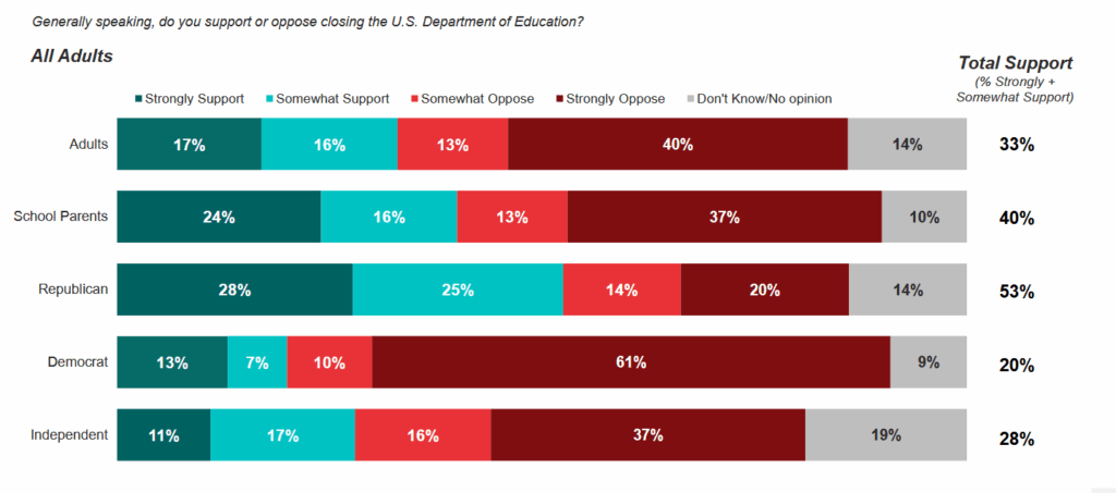 While 33 percent of adults were found to support dismantling the Department, this share increases to 40 percent among parents of school-aged children.