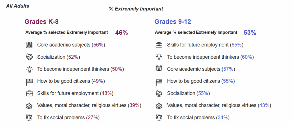 This survey also gauged what Americans believe should be the “main purpose of education” for K-8 students, as well as for high school students.