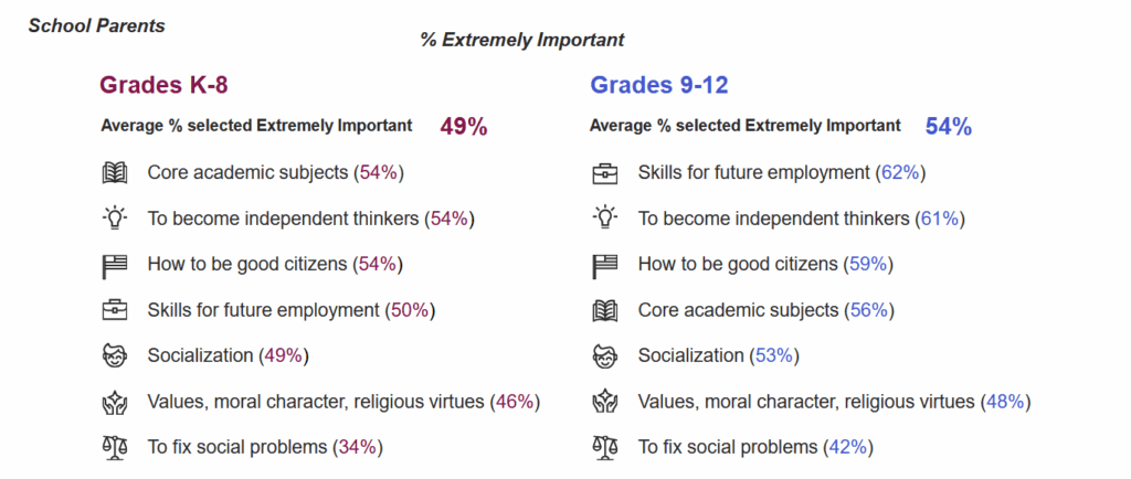 Less than half of parents, as well as adults overall, think that education should focus on conveying “values, moral character, religious virtues,” although parents tended to think this should be prioritized moreso than the general population.