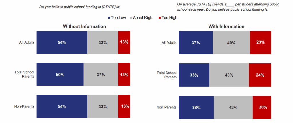 Across all of these groups, respondents were significantly less likely to say that per pupil spending was too low when provided with publicly available information about their state’s average spending per student.