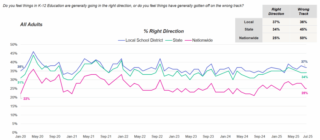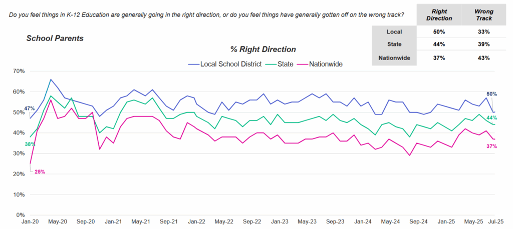 Optimism about the direction of K-12 education is much higher among parents, where confidence that things are on the right track was found to be 50 percent at the local level and 37 percent at the national level.