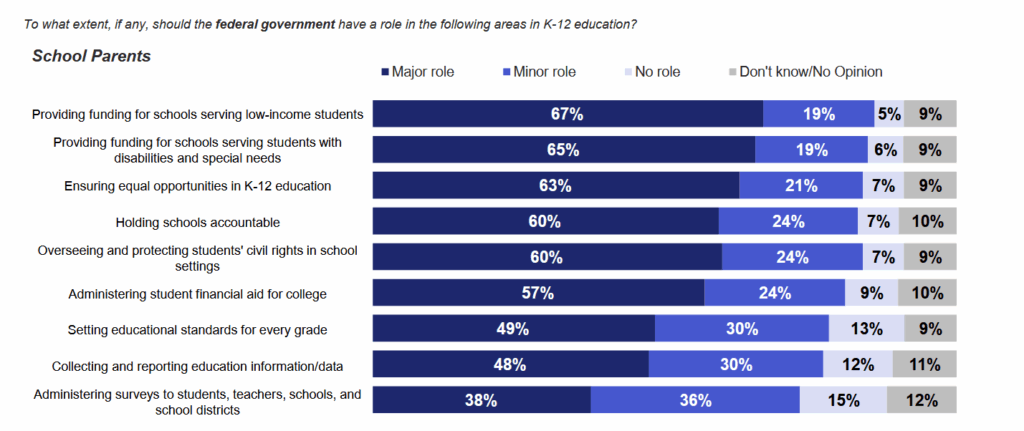 Over 60 percent of school parents felt that the federal government should play a “major role” in funding schools that serve low-income students, providing funds to help support students with disabilities and special needs, and “ensuring equal opportunities” in K-12 education.