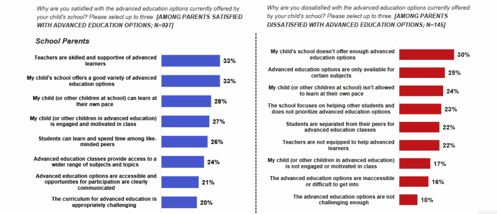 As it currently stands, private school parents are significantly more satisfied with the advanced educational opportunities available to their children than public school parents. While 85 percent of private school parents feel that the current offering available to their children are suitable, the same is true for only 65 percent of public school parents.