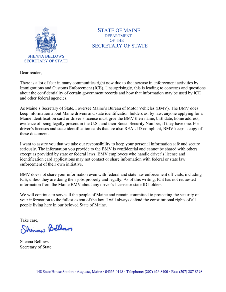 “BMV does not share your information even with federal and state law enforcement officials, including ICE, unless they are doing their jobs properly and legally. As of this writing, ICE has not requested information from the Maine BMV about any driver’s license or state ID holders,” said Bellows.