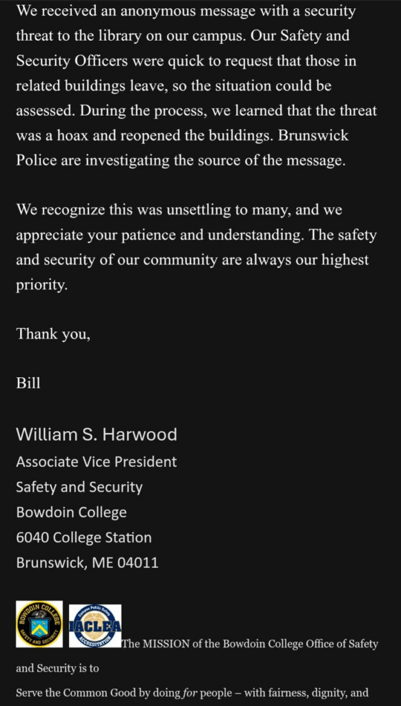 Campus safety officers soon learned that the threat was a hoax, and Bowdoin allowed people to return to the affected buildings.