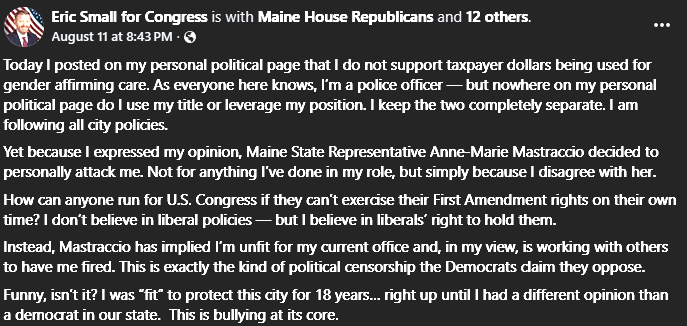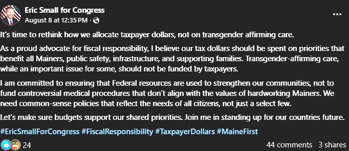 “As a proud advocate for fiscal responsibility, I believe our tax dollars should be spent on priorities that benefit all Mainers, public safety, infrastructure, and supporting families. Transgender-affirming care, while an important issue for some, should not be funded by taxpayers,” said Small.