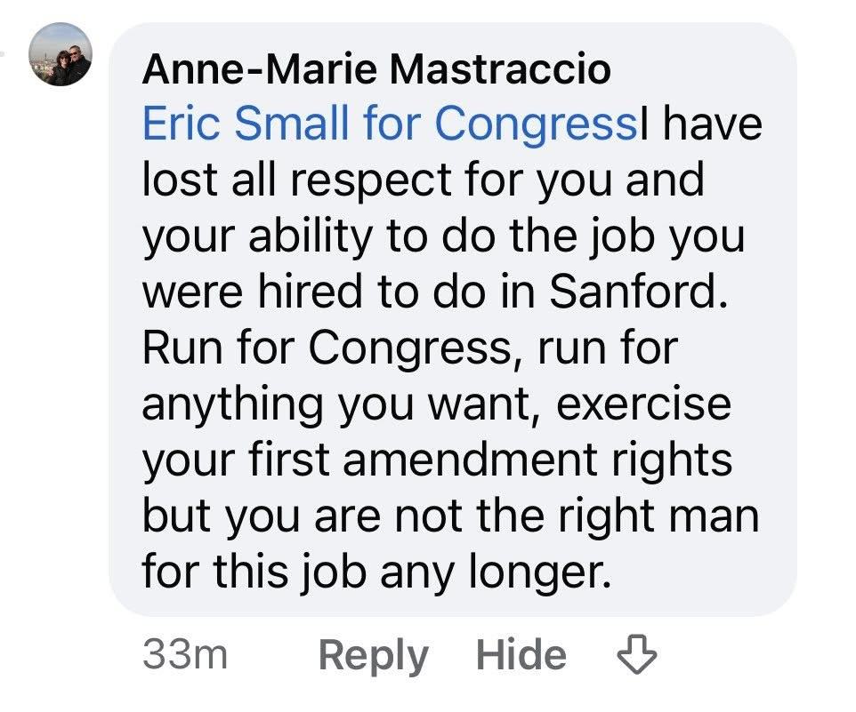 According to Small, that post was enough for Mastraccio to claim that he is unfit to serve as Sanford’s Chief of Police. Small argued that he has a First Amendment right to express his views as part of his CD1 political campaign and that he has followed all Sanford policies while keeping his campaign and police position separate.