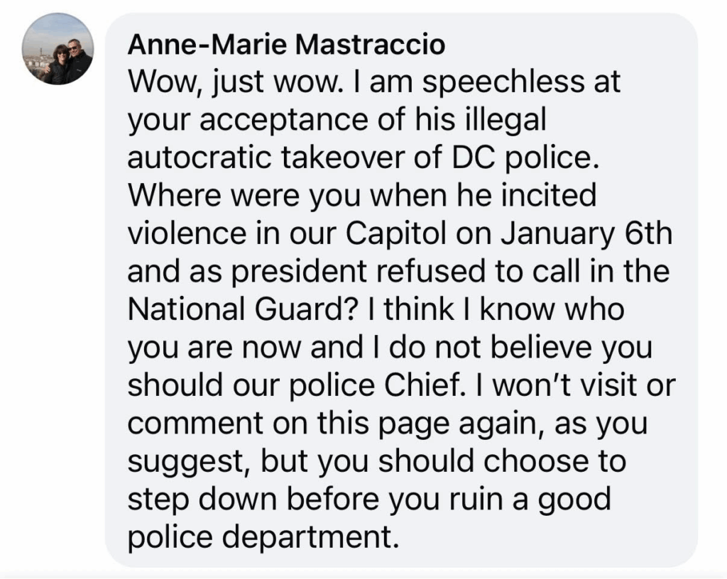 In her other screenshotted comment, Mastraccio criticized Small for supporting President Donald Trump’s use of the National Guard to prevent crime in Washington, D.C., and promised that she would no longer visit his campaign page.