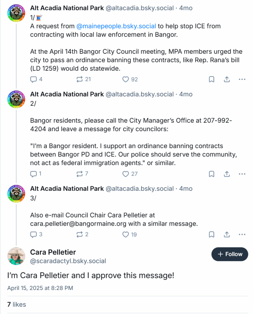 Pelletier used her account to promote anti-Immigration and Customs Enforcement (ICE) policies, supporting proposals for a city ordinance banning local law enforcement from cooperating with immigration authorities.