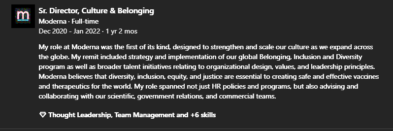 According to her LinkedIn page, she served as the “Senior Director of Culture and Belonging” at Moderna, a pharmaceutical company responsible for one of the most prominent COVID-19 vaccines.