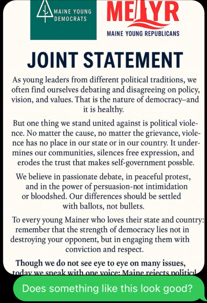 “Our differences should be settled with ballots, not bullets. To every young Mainer who loves their state and country: remember that the strength of democracy lies not in destroying your opponent, but in engaging them with conviction and respect,” the added.