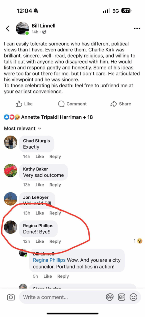 One Portland City Councillor, Regina Philips, also appeared to imply that she was celebrating the conservative father’s death in a public social media post made from her personal Facebook account.