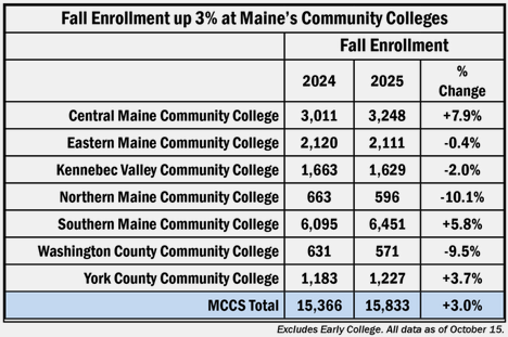 Central Maine Community College and Southern Maine Committee College saw the most substantial increases in their enrollment numbers, going up by 7.9 percent and 10.1 percent respectively.