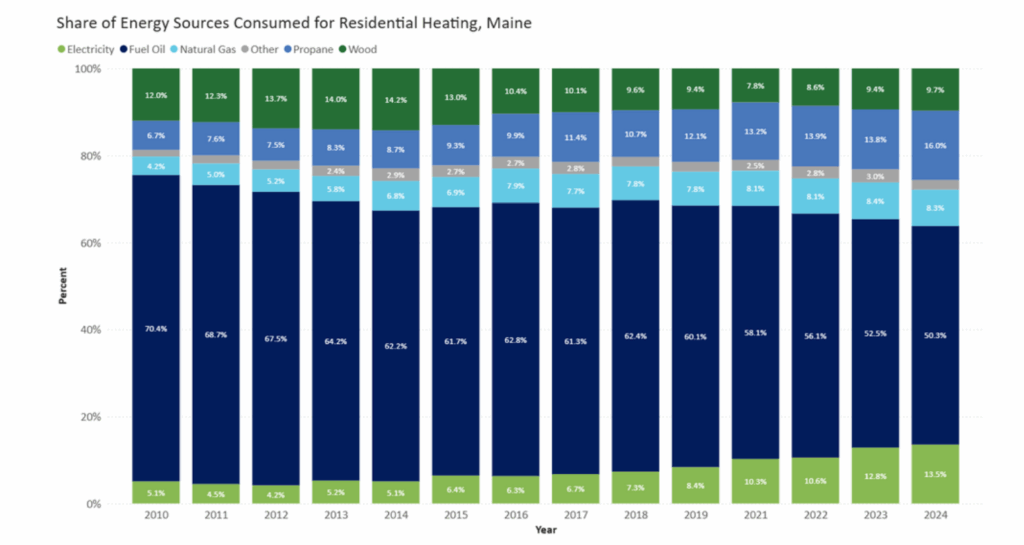 Federal data shared by the State of Maine reveals that 50.3 percent of residential heating is achieved with fuel oil, a proportion that has steadily declined for the past several years as alternatives have begun to gain prominence.