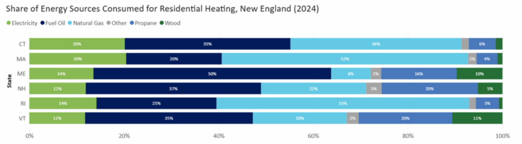 In no New England state does electricity stand as the dominant energy source for residential heating, accounting for only 12 percent to 20 percent of total consumption.