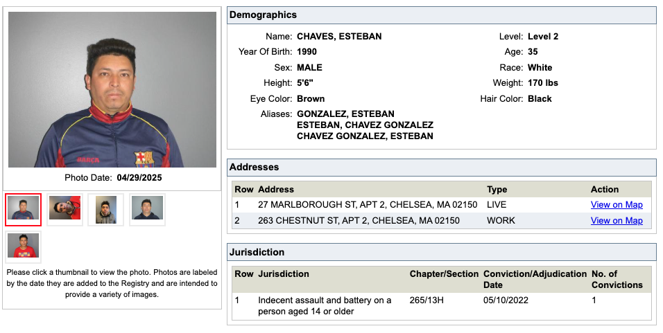 Chavez-Gonzalez is classified as a Level 2 registered sex offender in Massachusetts stemming from a 2022 conviction for indecent assault and battery on a person aged 14 or older, according to the Commonwealth’s Sex Offender Registry Board.