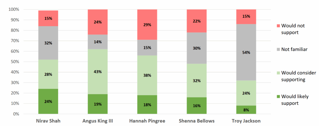 Leads shift, however, if only those who said that they would “likely” support a given candidate are considered. Looking at this data alone, Shah holds a five-point advantage at 24 percent, while King, Pingree, and Bellows fell into the middle of the pack. Jackson remains the least popular at 8 percent.