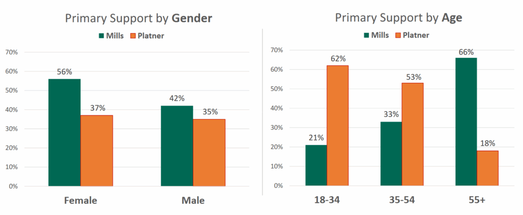 Support for Mills and Platner varied widely, however, based on age and gender, with women primarily backing Mills and men mostly expressing an interest in Platner.