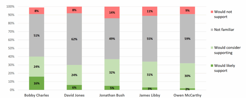 Considering only the share of voters who expressly said that they would “likely” support, Charles continues to hold the lead position, but Jones moves up to second place with 6 percent, followed closely by Bush and Libby at 5 percent and 3 percent respectively. McCarthy takes last place in this line up at 2 percent.