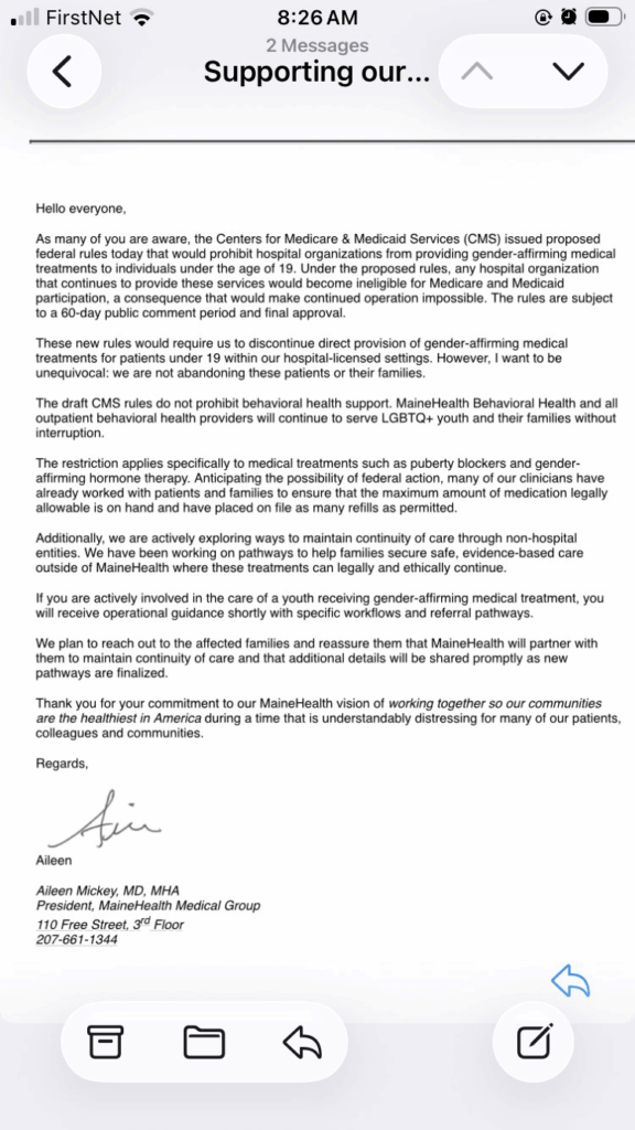 MaineHealth pointed out that the new rules will not prohibit “behavioral health support,” and their behavioral health facilities will continue to serve “LGBTQ+ youth.”