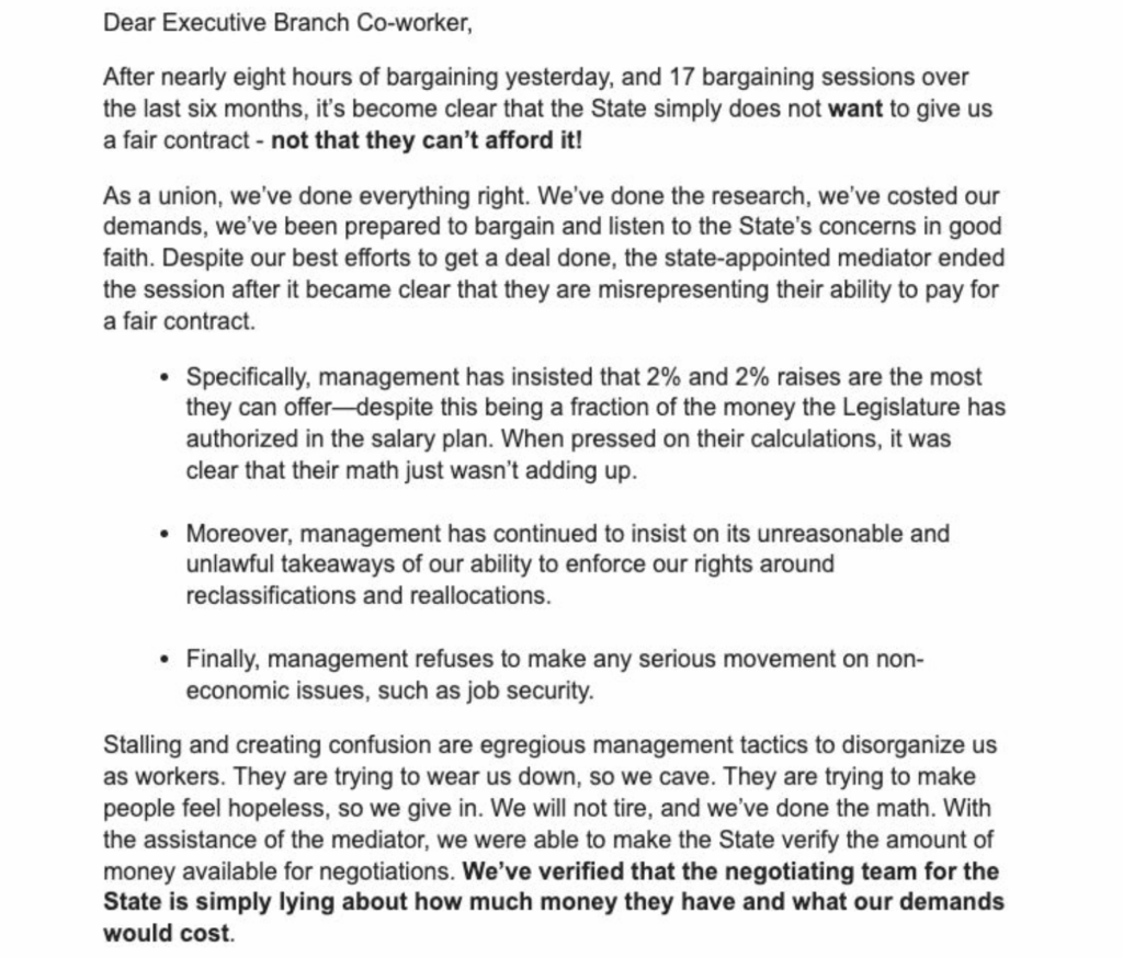 In the latest email, the union told members that the state has insisted “2% and 2% raises are the most they can offer,” which MSEA described as “a fraction of the money the Legislature has authorized in the salary plan.” The bargaining team said that when union negotiators pressed for details, “their math just wasn’t adding up.”