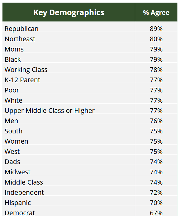 76 percent of Independents, 73 percent of Republicans, and 64 percent of Democrats also agree with this sentiment.