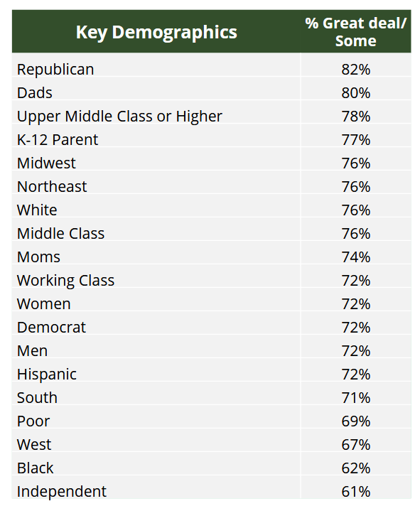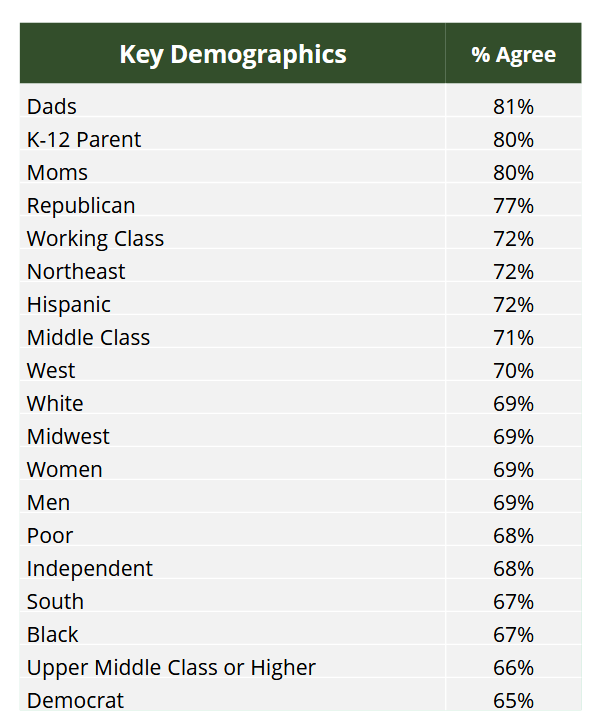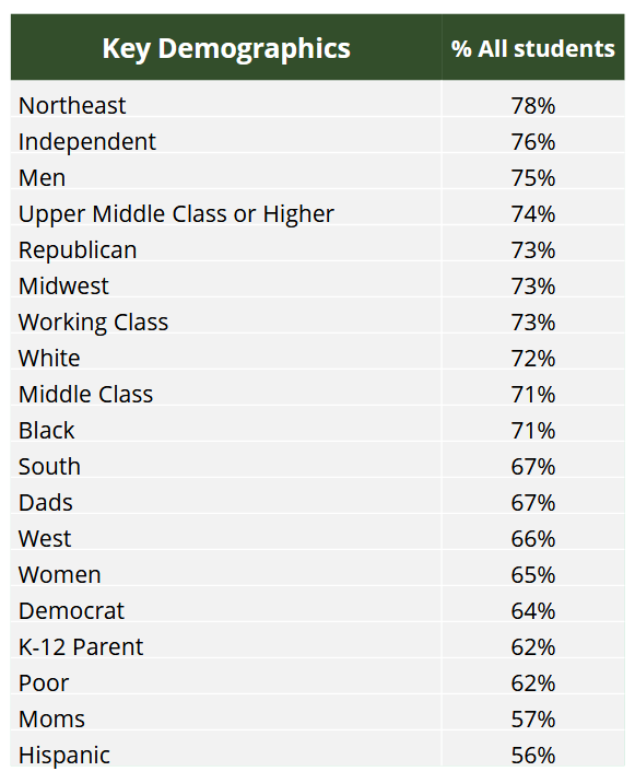 This opinion, supported by 72 percent of respondents, was also shared by 77 percent of K-12 parents, 82 percent of Republicans, 72 percent of Democrats, and 61 percent of Independents.
