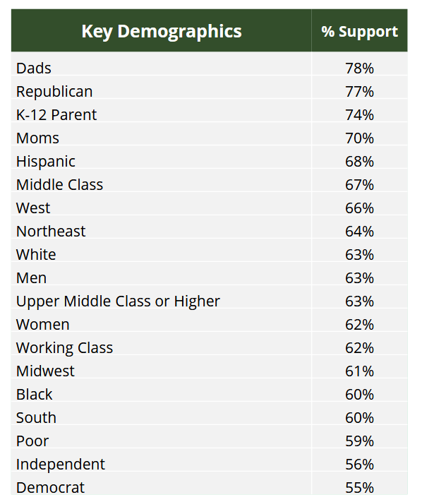 ESAs also earned support from the majority of respondents in all reported demographic subgroups, including 55 percent of Democrats, 56 percent of Independents, and 77 percent of Republicans.