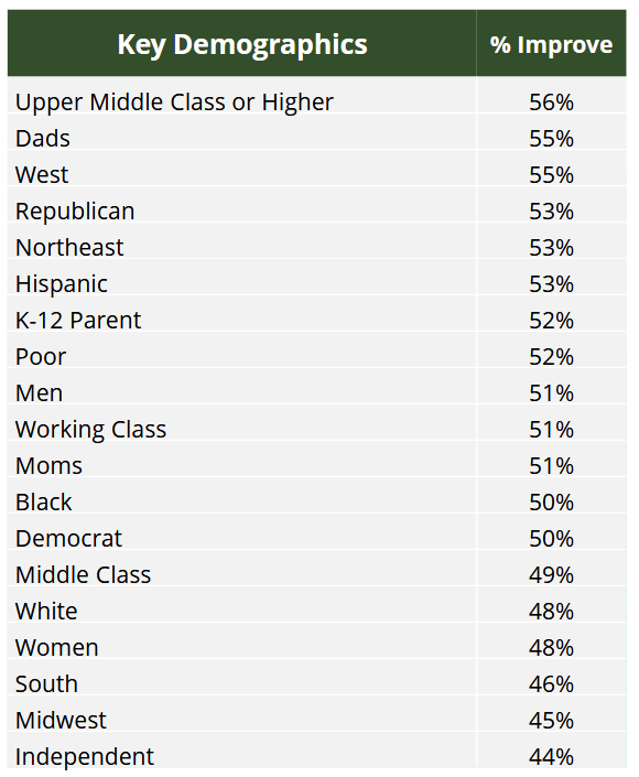 Once again, despite the higher margins of support for the policy itself, only 53 percent of respondents said that they believe making these tax credits a reality would improve the nation’s overall education system.