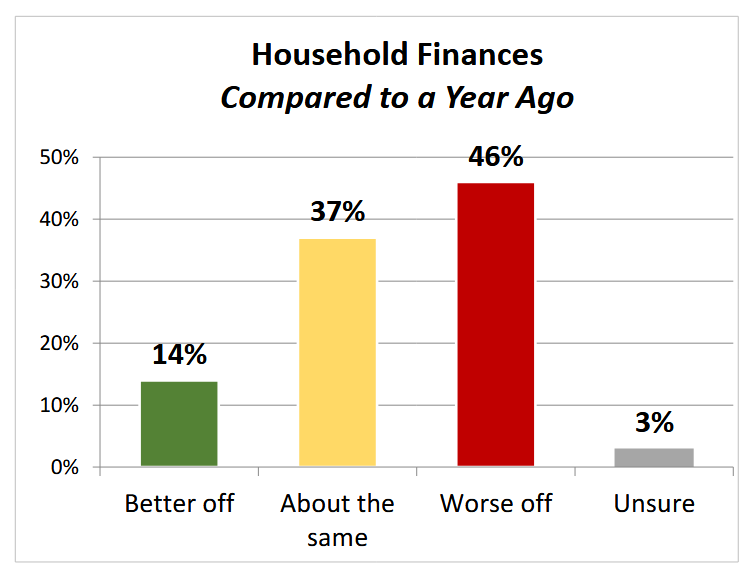 46 percent of those surveyed feel that they are worse off financially than this same time last year, while 37 percent indicated that things are about the same. Just 14 percent said that they are currently in a better position.