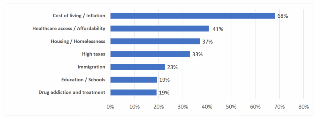 Health care access and affordability came in at a distant second, alongside housing and homelessness, as well as high taxes.
