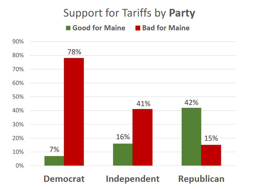 While nearly 80 percent of Democrats feel that federal tariffs have negatively affected Maine, the same is true for just 41 percent of Independents and only 15 percent of Republicans.