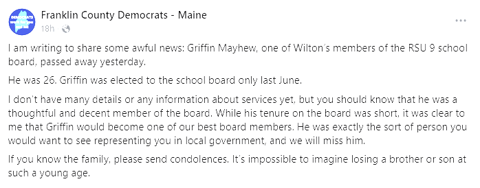 Regional School Unit (RSU) 9 school board member Griffin Mayhew, 26, representing Wilton, died unexpectedly on Monday, just months after he first took office in June.