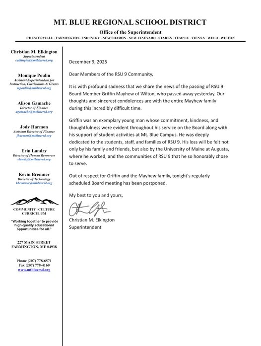 “Griffin was an exemplary young man whose commitment, kindness, and thoughtfulness were evident throughout his service on the Board along with his support of student activities at Mt. Blue Campus.