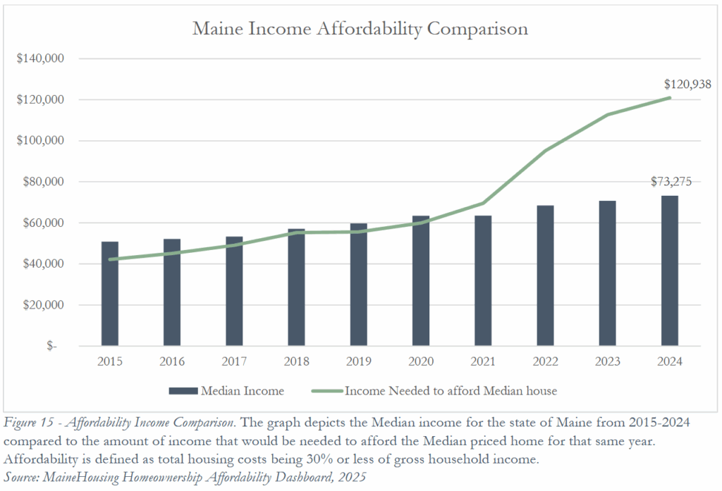 While the median income in Maine has risen 44 percent between 2015 and 2025, the median home price has increased by a whopping 187 percent. Rising prices have also impacted the rental market, resulting in an increasing share of tenants bearing an outsized cost burden for their housing.