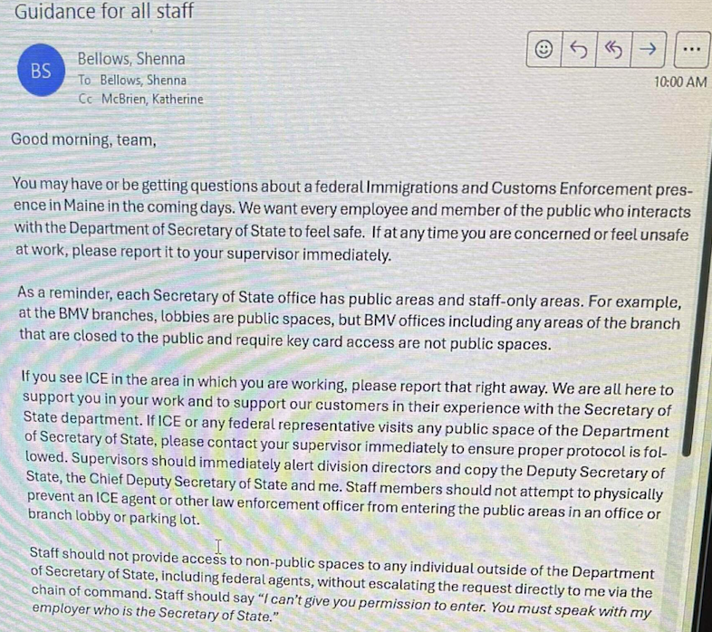 The message, titled โGuidance for all staff,โ warns employees they โmay have or be getting questionsโ about ICE activity in Maine โin the coming days.โ Bellows wrote that the department wants every employee, and every member of the public who interacts with the Secretary of Stateโs office, to โfeel safe,โ and directed workers who feel concerned or unsafe to report it to their supervisor immediately.