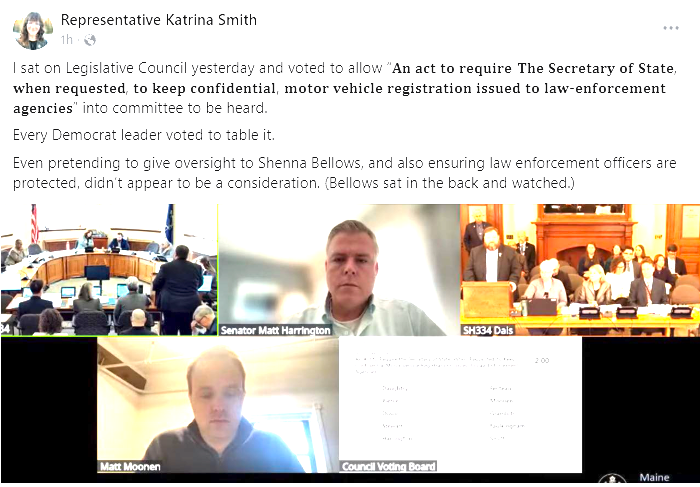 “Every Democrat leader voted to table it. Even pretending to give oversight to Shenna Bellows, and also ensuring law enforcement officers are protected, didn’t appear to be a consideration. (Bellows sat in the back and watched,” said Rep. Katrina Smith (R-Palermo) on Facebook.