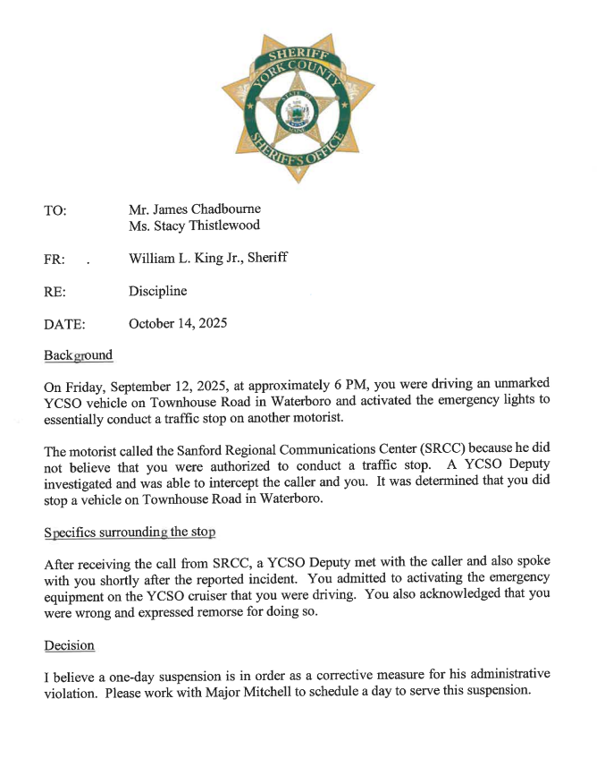 “You admitted to activating the emergency equipment on the YCSO cruiser that you were driving. You also acknowledged that you were wrong, and expressed remorse for doing so,” said Sheriff King in his disciplinary note to Chadbourne.