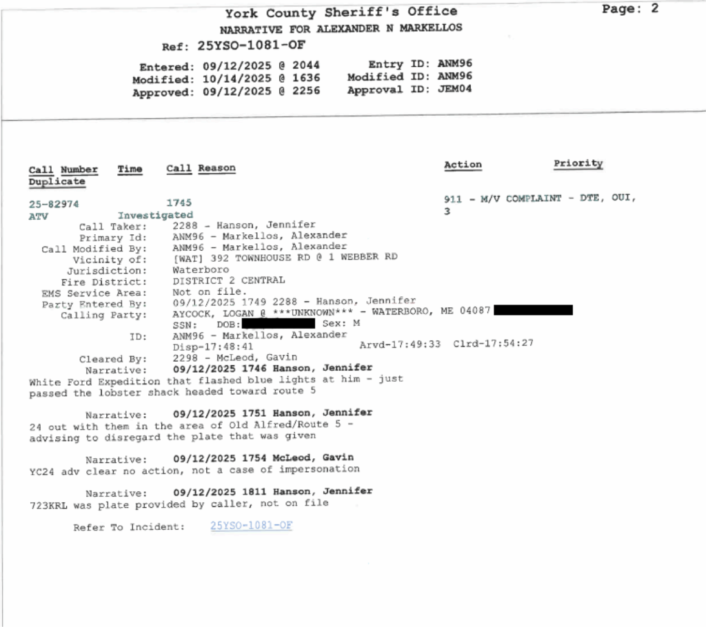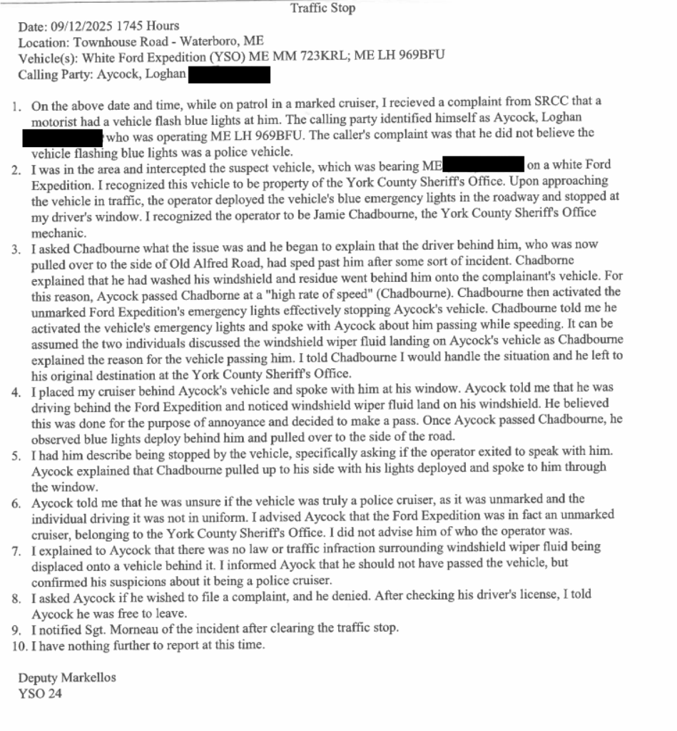 In his phone interview with The Maine Wire, Aycock said that the deputy he spoke with, Markellos, told him that the person who pulled him over was a “cop.”