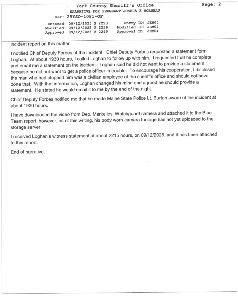 Another deputy, Sergeant Joshua Morneau, filed his own report on the incident based on his interaction with Chadbourne upon his return to the York County Sheriff’s Office following the incident.