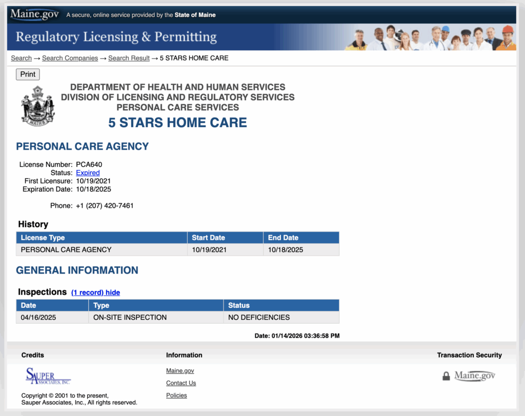 State licensing records strangely reveal that 5-Star allegedly received an “on-site” inspection on April 16, 2025, after Alahmedi’s audit, which found no deficiencies.