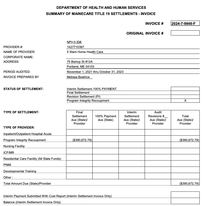 Those MaineCare payments include $432,384.72 paid out to Alahmedi in 2024 while 5 Stars Home Health Care was suspected of billing in the previous years with an error rate of more than 65 percent. The home health care agency was administratively dissolved in Nov. 2024, just two months before DHHS turned off the MaineCare money spigot in Feb. 2025.
