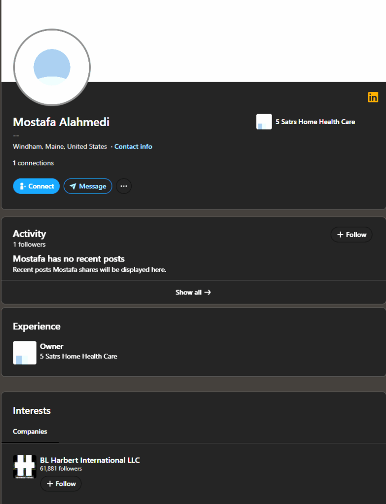 He does not appear to have a social media presence either, except for a nearly blank LinkedIn page that lists him as the owner of “5 Stars Home Care” and claims that he lives in Windham.