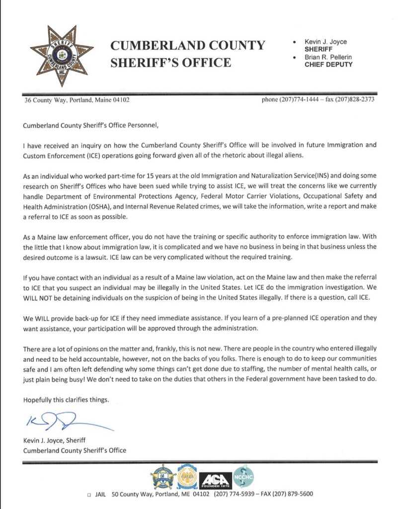 Inside the Cumberland County Sheriff’s Office, Joyce has already circulated guidance on how deputies are expected to handle ICE-related situations. In a Feb. 25, 2025, memo to personnel reviewed by The Maine Wire, Joyce wrote that local law enforcement generally lacks the training or specific authority to enforce immigration law, calling it complicated and warning that stepping into that lane invites legal exposure.