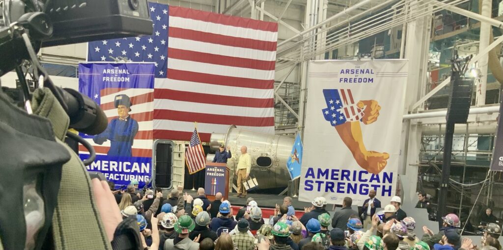 Throughout the speech, he repeatedly tied the shipyard’s work to the safety and success of troops in uniform, calling service members “the real 1%” but stressing they depend on industrial production behind the scenes. “They can’t do their work without all of you standing behind them,” he said. “They literally can’t win the next fight without you.”