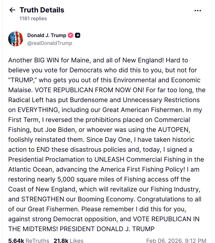 He congratulated fishermen and urged voters to back Republicans going forward, calling on them to “VOTE REPUBLICAN IN THE MIDTERMS,” and said the action was taken despite what he described as strong Democratic opposition.