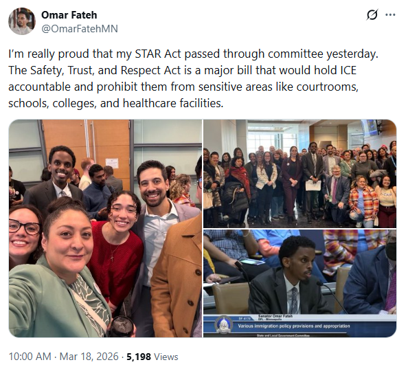 Minnesota Sen. Omar Fateh announced on X that his Safety, Trust, and Respect (STAR) Act passed through committee this week, a measure in which U.S. Immigration and Customs Enforcement is now prohibited from entering courtrooms, schools, colleges, and health care facilities.